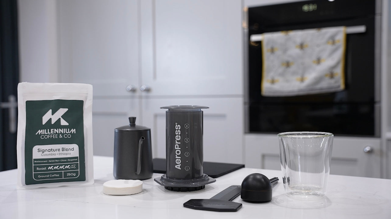Grind your Millennium coffee beans to a medium to fine consistency, similar to table salt. You’ll need 15g of ground Millennium coffee.