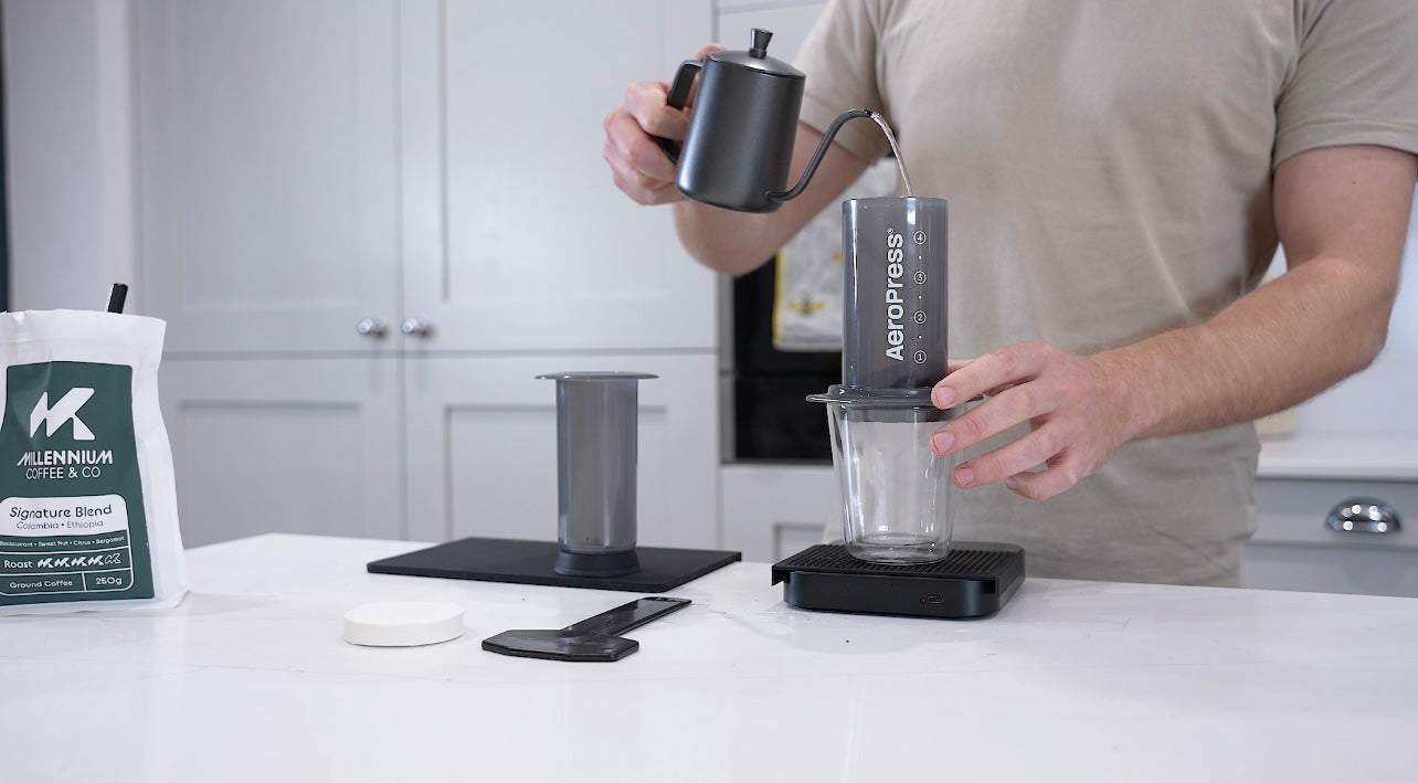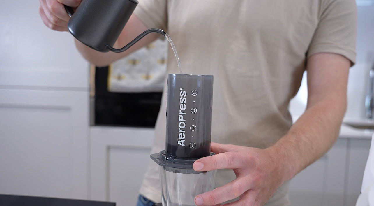 Once you’ve measured your ingredients, add the coffee to the AeroPress chamber. Start your timer and pour hot water over the grounds, you want this as even as possible. Stir the coffee and water gently for around 10 seconds.