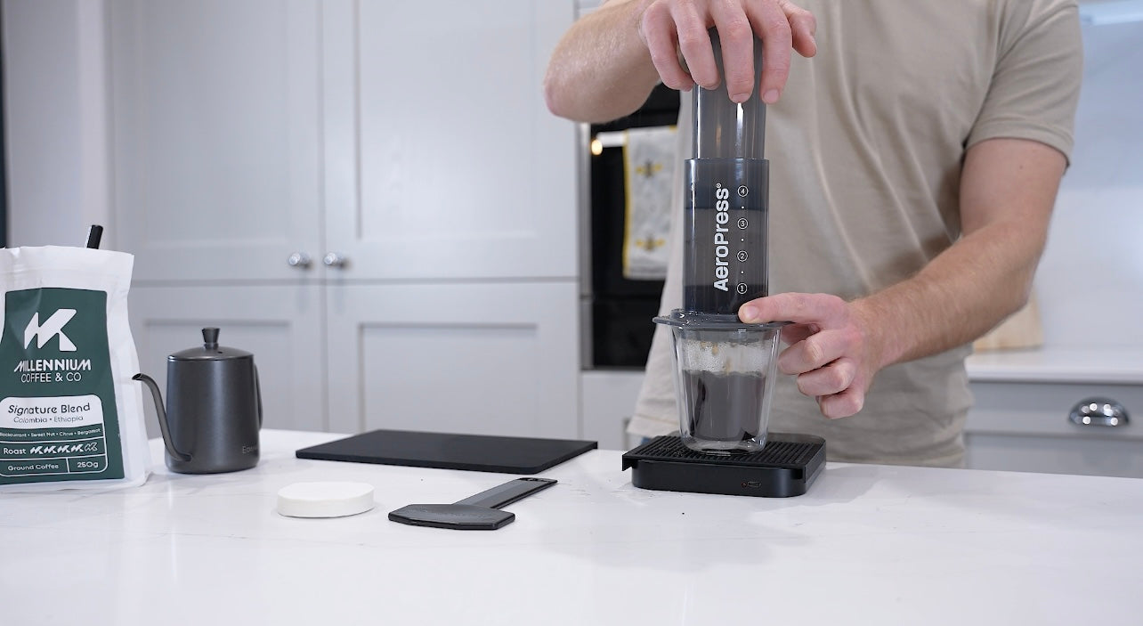 After stirring, insert the plunger into the AeroPress chamber and press down gently but steadily. You want a consistent pressure when doing this and should take around 20 – 30 seconds when doing this.