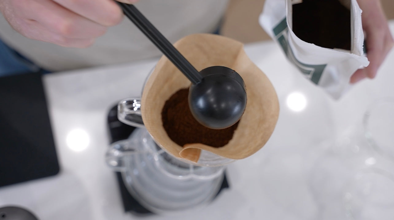 Place the ground coffee into the wet paper filter within your V60. Gently shake to level the grinds and place your cup underneath.